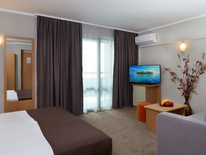 - Štúdio (STX1), štúdio, v hlavnej budove, výhľad na bazén, cca 22 m², posledná kompletná rekonštrukcia v roku 2018, celkový počet izieb v tomto type izby: 1, rozloženie takto: kombinovaná obývacia izba/spálňa, 2 samostatné postele , 1 rozkladacia pohovka, detská postieľka: zadarmo , nutná požiadavka, klimatizácia: zadarmo, individuálne nastaviteľná, podlaha: koberec, pohovka, písací stôl, telefón, Internet: WLAN/WiFi: zadarmo, v cene all inclusive, TV: plochá obrazovka, káblová TV, izbová služba: za príplatok, vaňa alebo sprcha, WC, balkón alebo terasa: s posedením