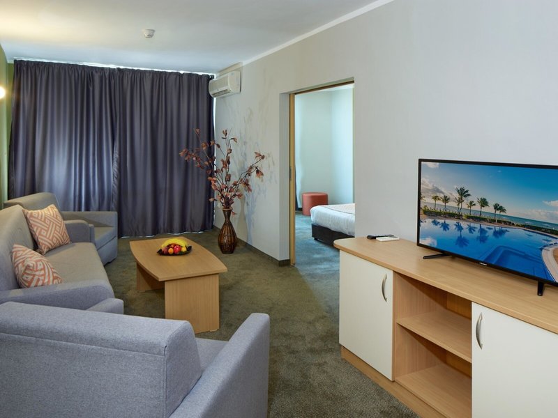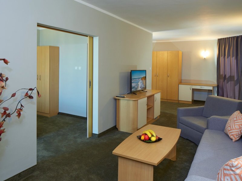 - Typ apartmánu (APX1), apartmán, v hlavnej budove, výhľad na bazén, cca 49 m², posledná kompletná rekonštrukcia 2018, celkový počet izieb v tomto type izby: 2, rozloženie: obývacia izba, 1 spálňa, 1 manželská posteľ , 2 rozkladacie pohovky, detská postieľka: bez poplatku , nutná požiadavka, klimatizácia: zadarmo, individuálne nastaviteľná, podlaha: koberec, pohovka, písací stôl, telefón, Internet: WLAN/WiFi: zadarmo, v cene all inclusive, TV : plochá obrazovka, káblová TV, izbová služba: za poplatok, vaňa, WC, balkón alebo terasa: s posedením