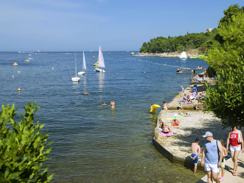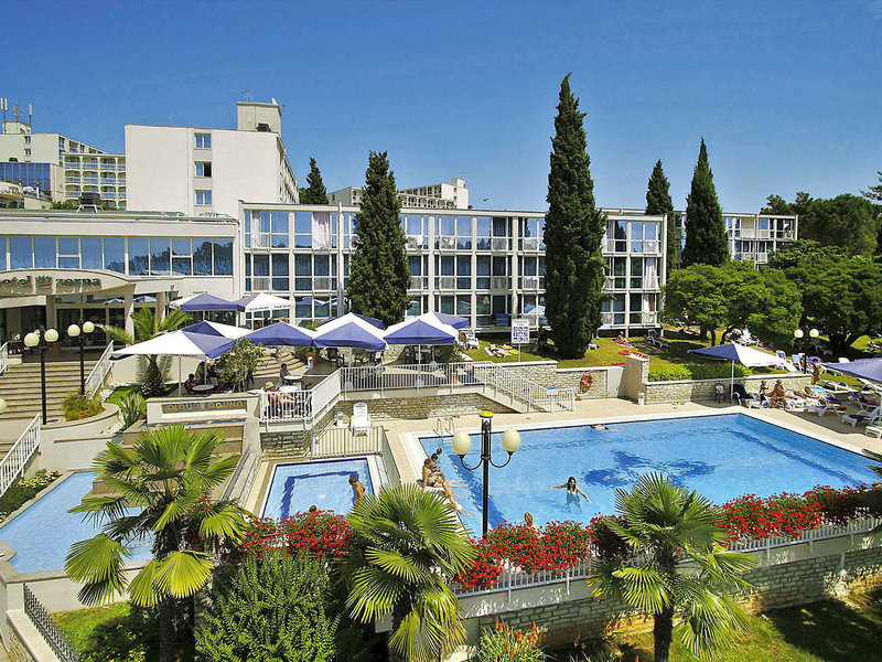 Lage & Umgebung Das Hotel liegt direkt, nur durch die Uferpromenade getrennt, am Kies und Felsstrand, in der sogenannten blauen Lagune. Bis zum Stadtzentrum sind es ca. 5 km. Nach Porec gelangt man mit einem Bus, der regelmäßig pendelt und dessen Haltestelle direkt beim Hotel liegt. In der unmittelbaren Umgebung des Hotels befinden sich eine Reihe von Restaurants, Bars und Geschäften.
