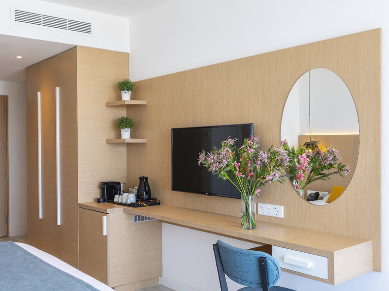 • Superior Sea View (STM1), štúdio, nefajčiarska izba, v hlavnej budove, výhľad na more, cca 26 m², posledná kompletná rekonštrukcia v roku 2019, celkový počet izieb v tomto type izby: 1, rozloženie: kombinovaná obývačka/ spálňa, 1 manželská posteľ (140x190cm), Klimatizácia: zadarmo, v závislosti od ročného obdobia, podlaha: dlažba, trezor: zadarmo, chladnička: zadarmo, príslušenstvo na prípravu kávy/čaju, telefón, Internet: WLAN/WiFi : zadarmo, TV: plochá obrazovka, v obývacej časti, upratovanie: denne, zadarmo, sprcha, WC, balkón