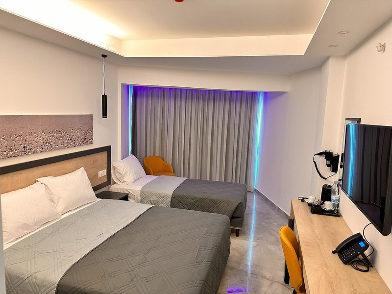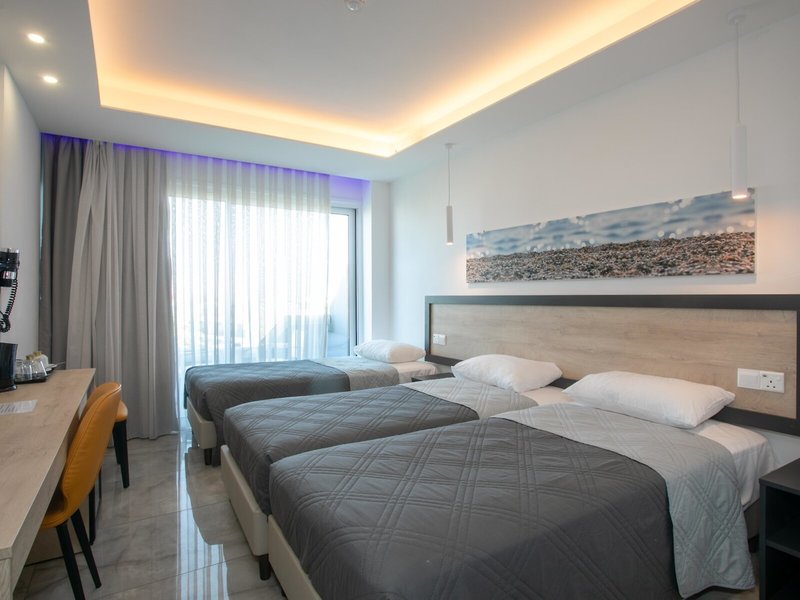 • Family LSV (FZX2), Dreibettzimmer, Nichtraucherzimmer, im Hauptgebäude, Poolseite, seitlicher Meerblick, Poolblick, ca. 18 - 22 m², letzte Komplettrenovierung 2025, 1 Einzelbett (90x200cm), 1 Doppelbett (160x200cm), 1 Kinderbett, Babybett, Klimaanlage: individuell regelbar, zentral gesteuert, kalt, warm, Heizung: individuell regelbar, zentral gesteuert, Fußboden: Fliesenboden, Safe: ohne Gebühr, Schreibtisch, Bügeleisen, Bügelbrett, Telefon, Internet: WLAN/WiFi: ohne Gebühr, Fernseher: Flatscreen, deutsches Programm, Sat-TV, Roomservice: mehrmals pro Woche, Dusche, WC, Balkon oder Terrasse: mit Sitzgelegenheit