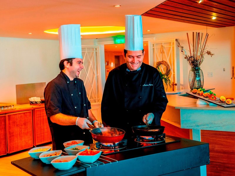 Essen & Trinken: Die gastronomischen Einrichtungen umfassen ein Café und eine Bar. Die Gäste werden kulinarisch verwöhnt im Nichtraucherrestaurant mit Klimaanlage und Kinderhochstühlen. Das Haus bietet als buchbare Verpflegungsleistungen Halbpension und All-Inclusive. Die All-inclusive-Urlauber genießen besondere Extras wie Snacks, dazu gibt es eine Auswahl alkoholischer und alkoholfreier Getränke. Ein reichhaltiges Frühstücksbuffet garantiert einen guten Start in den Tag. Mittags gibt es die Wahl zwischen à la carte und Menü und abends zwischen Buffet, à la carte und Menü. Diätgerichte, glutenfreie Mahlzeiten und vegetarische Gerichte werden auf Wunsch zubereitet. Darüber hinaus stellt das Hotel spezielle Verpflegungsangebote bereit. Eine besondere Attraktion ist das Showcooking.