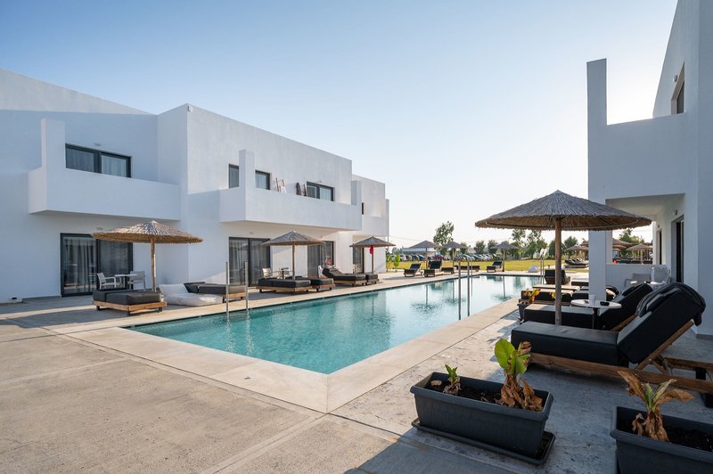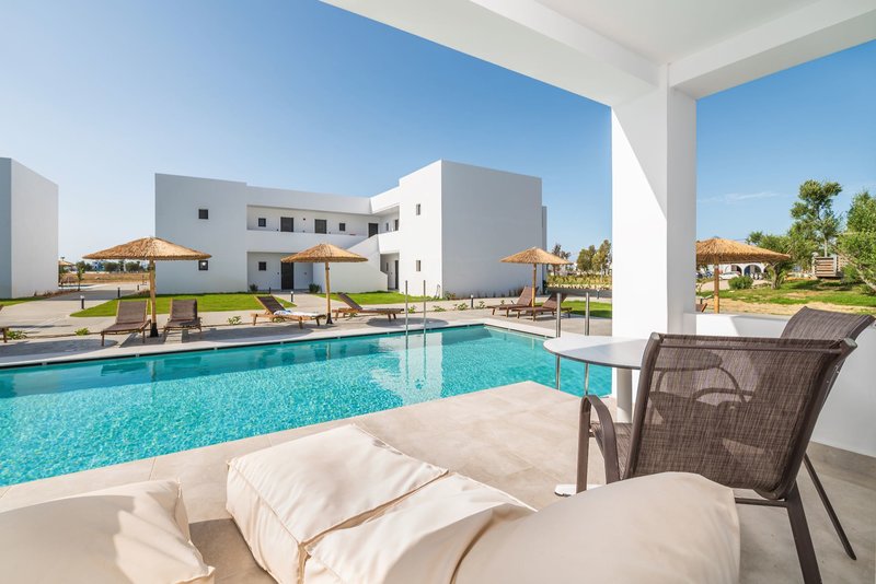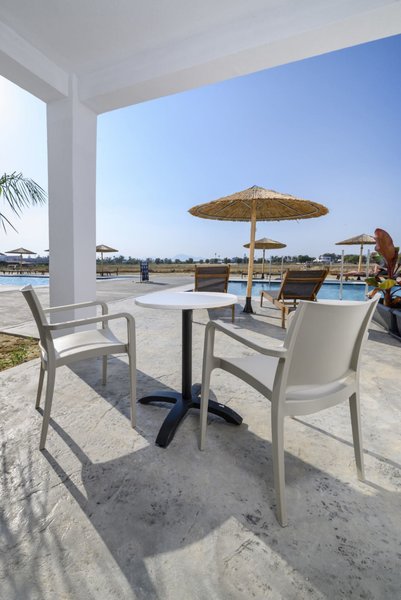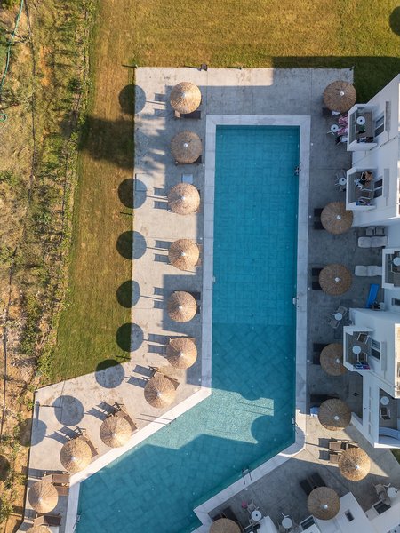 In der gepflegten Gartenanlage laden der großzügige Gemeinschaftspool, eine Sonnenterrasse mit Liegen und Schirmen, die Poolbar sowie eine traditionelle Taverne zum Entspannen ein. Zusätzlich stehen vier Sharingpools mit Salz-Elektrolyse für die Zimmerkategorien Deluxe Sharing Pool sowie Deluxe-Zimmer mit privaten Liegen zur Verfügung. Für die Premium-Deluxe Doppelzimmer Sharing Pool gibt es insgesamt fünf weitere Sharingpools. Ein neu angelegter Pool neben dem Gemeinschaftspool dient ebenfalls als Sharingpool für diese Zimmerkategorie.