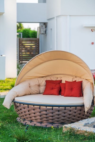 V dobre udržiavaných záhradách pozývajú hostí na relax priestranný spoločný bazén, slnečná terasa s ležadlami a slnečníkmi, bar pri bazéne a tradičná taverna. Okrem toho sú pre hostí v kategóriách izieb Deluxe so zdieľaným bazénom a izieb Deluxe so súkromnými ležadlami k dispozícii štyri spoločné bazény so soľnou elektrolýzou. Pre hostí v izbách Premium Deluxe s manželskou posteľou a zdieľaným bazénom je k dispozícii celkovo päť ďalších spoločných bazénov. Novovybudovaný bazén vedľa spoločného bazéna slúži aj ako spoločný bazén pre túto kategóriu izieb.