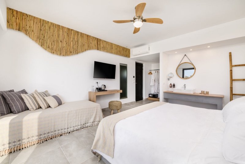 Doppelzimmer Deluxe Poolblick private Liegen: Sind in der ersten Etage gelegen und verfügen bei gleicher Innenausstattung und Größe wie die Doppelzimmer Deluxe privater Garten über einen Zugang zum Sharing Pool mit reservierten Sonnenliegen und einen möblierten Balkon anstelle eines privaten Gartens(PDL/PDI). Wahlweise zur Alleinbenutzung buchbar (YN1).