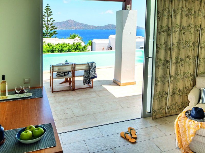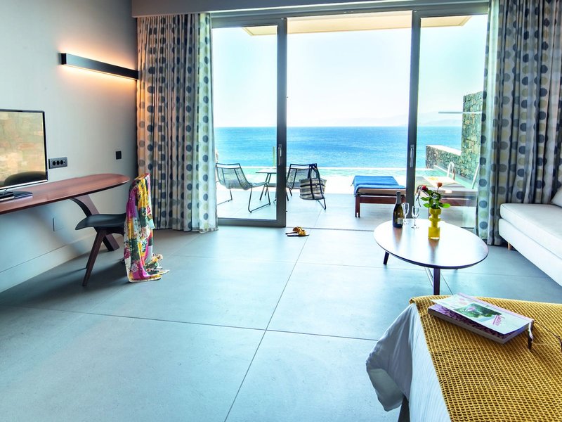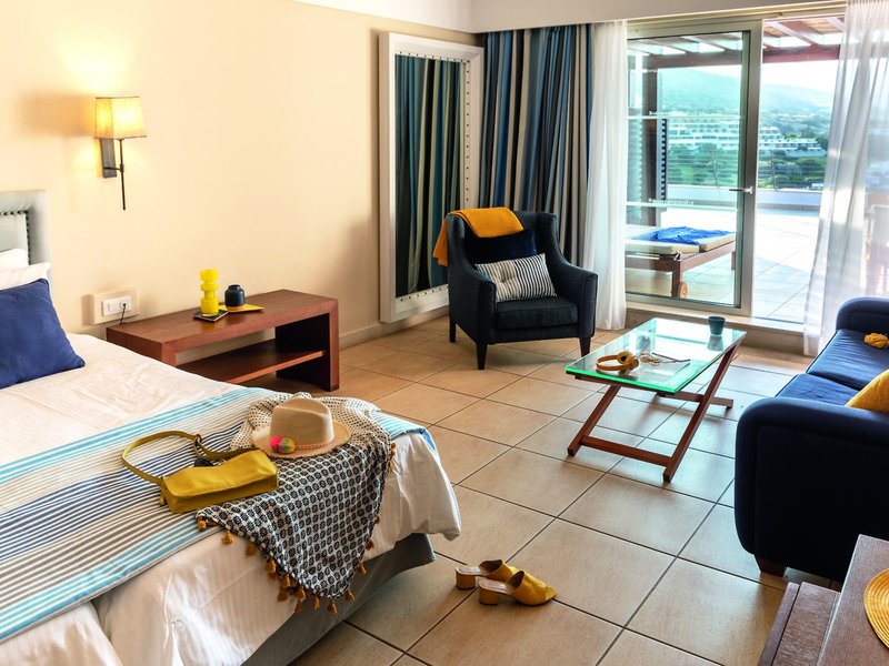 - Junior suite sea view Mythica (JSM1), Juniorsuite, im Hauptgebäude, im Nebengebäude, Meerblick, ca. 45 m², Gesamtanzahl der Räume in diesem Zimmertyp: 1, Aufteilung wie folgt: kombiniertes Wohn-/Schlafzimmer, Klimaanlage: zentral gesteuert, Safe: ohne Gebühr, Sofa, Kaffee-/Teezubereiter, Minibar: gegen Gebühr, bei All Inclusive inklusive, Softdrinks: gegen Gebühr, bei All Inclusive inklusive, Wasser: gegen Gebühr, bei All Inclusive inklusive, Minibarauffüllung: täglich, Telefon, Internet: WLAN/WiFi: ohne Gebühr, Fernseher: im Schlafzimmer, Sat-TV, DVD-Player, Radio, CD-Player, Roomservice: gegen Gebühr, Reinigungsservice: täglich, ohne Gebühr, Tageszeitung: ohne Gebühr, Badewanne, WC, Bademantel: ohne Gebühr, Slipper: ohne Gebühr, Föhn, Kosmetikspiegel, Balkon oder Terrasse: mit Liegen, mit Sitzgelegenheit