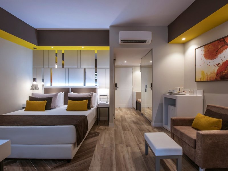 - Signature collection (DZX5), Doppelzimmer, Nichtraucherzimmer, ca. 30 - 34 m², Gesamtanzahl der Räume in diesem Zimmertyp: 1, Aufteilung wie folgt: kombiniertes Wohn-/Schlafzimmer, 1 Queen Size Bett, Babybett: ohne Gebühr, Anfrage nicht notwendig, Klimaanlage: ohne Gebühr, individuell regelbar, kalt, warm, Fußboden: Fliesenboden, Safe: ohne Gebühr, Sofa, Kühlschrank, Kaffee-/Teezubereiter, Wasserkocher, Telefon, Internet: WLAN/WiFi: ohne Gebühr, Fernseher: Flatscreen, deutsches Programm, Sat-TV, Reinigungsservice: täglich, Dusche, Badewanne, separates WC, Föhn, Kosmetikspiegel, Balkon: mit Sitzgelegenheit