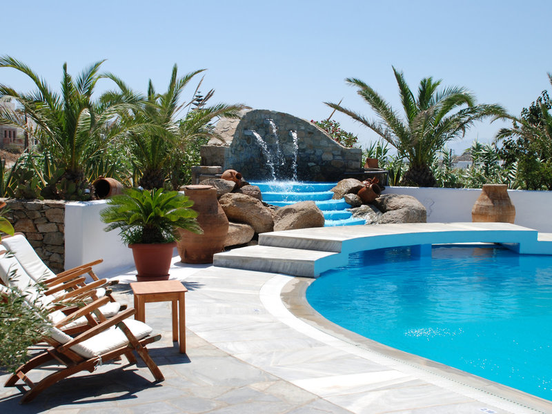 schön angelegten Pool. Das Hotel bietet eine ideale Ausgangslage für Ausflüge nach Mykonos-Stadt.