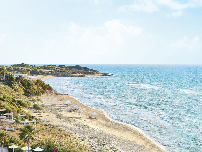• Strand „hotel's own beach“: Sand, feinsandig, flach abfallend, privat, hoteleigen, Liegen, Sonnenschirme
