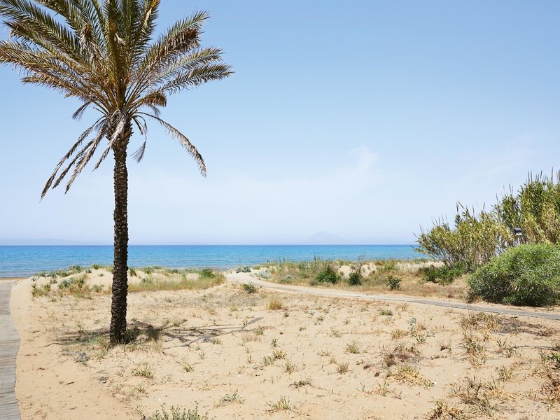 Poloha a okolie: Nachádza sa priamo na kilometrovej, mierne sa zvažujúcej piesočnatej pláži ocenenej Modrou vlajkou. Je súčasťou rozľahlého rezortu Grecotel Olympia Riviera. Mestečko Arkoudi je vzdialené 1,5 km chôdze. Obec Kastro je vzdialená asi 7 km.