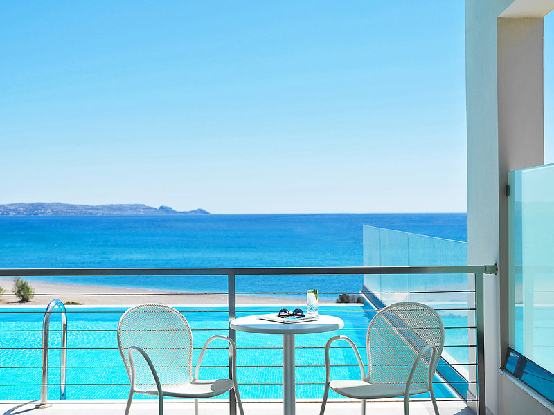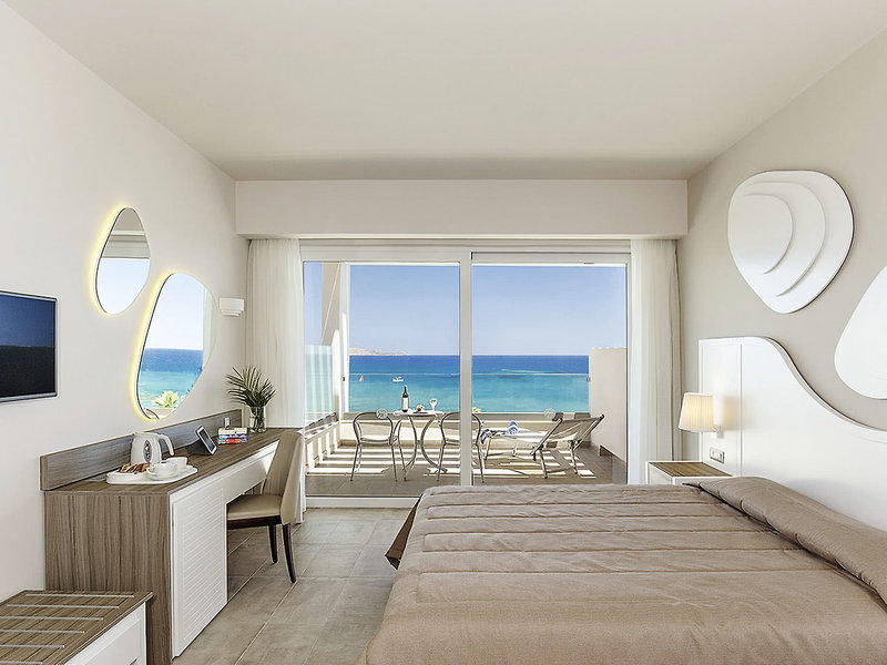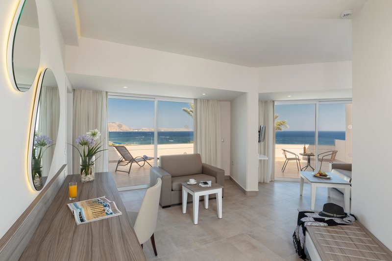 Executive-Suite (SUM, ca. 60 qm; RHO267), optisch abgetrennter Schlafbereich, Klimaanlage, Minibar, Kaffee-/Teezubereiter, 2 TVs, WLAN, Safe. Bad/Dusche, WC, Föhn, Bademantel, Slipper. Turn-down-Service. Großer Balkon/Terrasse, Meerblick. Max. 3E+1K