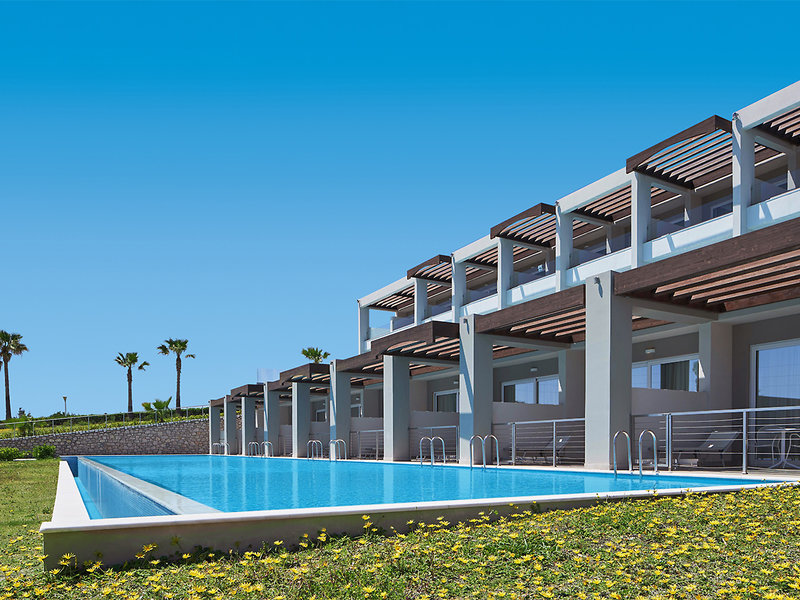 Executive-Familienzimmer (FA, ca. 39 qm; RHO267), 2015 erbaut, optisch abgetrennter Schlafbereich, Klimaanlage, Minibar, Kaffee-/Teezubereiter, 2 TVs, WLAN, Safe. Dusche, WC, Föhn, Bademäntel, Slipper. Terrasse/Balkon mit Zugang zum Sharingpool. Meerblick. Max. 3E+1K