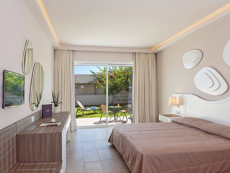 Familiensuite (FS, ca. 52 qm; RHO267), besteht aus 2 separaten Schlafzimmern, Klimaanlage, Minibar, Kaffee-/Teezubereiter, 2 TVs, WLAN, Safe. Bad/Dusche, WC, Föhn. Balkon oder Terrasse. Max. 4E+1K