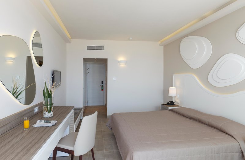 Obývacia izba: Dvojlôžková izba (DZ, cca 27 m², RHO167), klimatizácia, minibar, kávovar/čajník, TV, Wi-Fi, trezor. Vaňa/sprcha, WC, sušič vlasov. Balkón/terasa. Voliteľný výhľad na more (DZM). Max. 3 osoby, DZ je možné rezervovať aj pre jednu osobu (EZ).