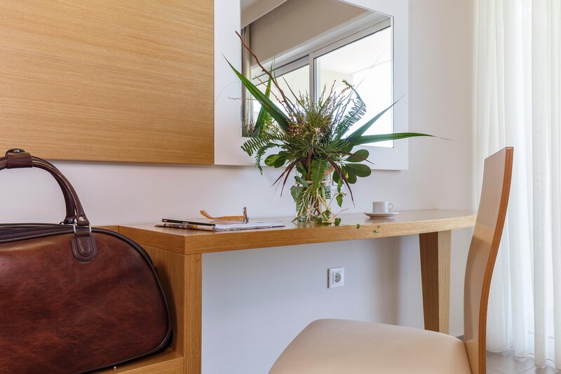 Dvojlôžková izba (DJ, cca 26 m2; RHO167), vo vedľajšej budove cez ulicu, klimatizácia, minibar, TV, WiFi, trezor. Kúpeľňa, WC, fén. Balkón/terasa. Maximálne 2E