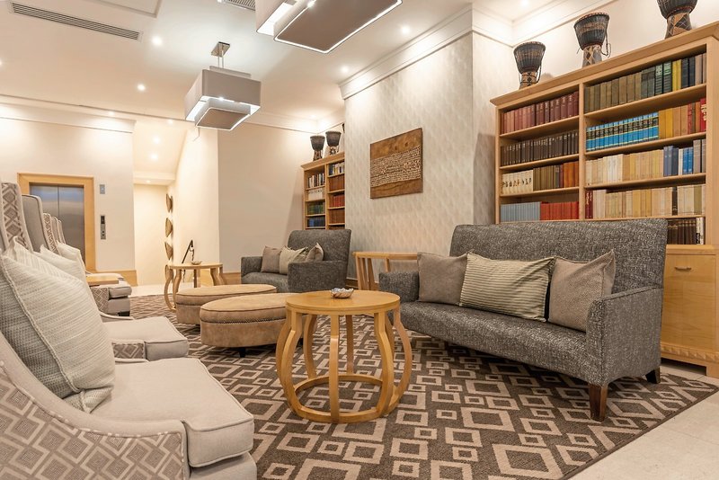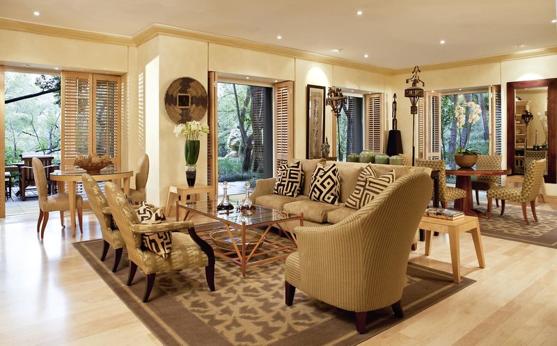 Die Zimmer: Die 53 erstklassigen Suiten sind elegant, im zeitgenössischen, afrikanischen Stil eingerichtet und verteilen sich auf das Hauptgebäude und einen über einen Skywalk erreichbaren separaten Villenbereich. Mit kombiniertem Wohn-/Schlafraum, großem Bad mit separater Dusche, Bademantel, Föhn, Satelliten-LCD-TV, DVD-Player, Telefon. Minibar und WLAN, Safe, Klimaanlage, Terrasse oder Balkon.