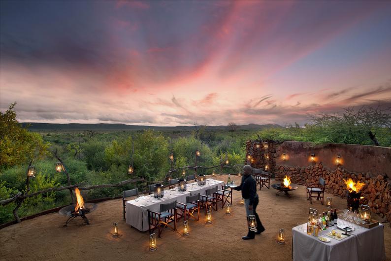 Kulinaria: Die Mahlzeiten werden im Speiseraum oder auf der Terrasse serviert, je nach Wetter Frühstück im Busch und Abendessen in der Boma.