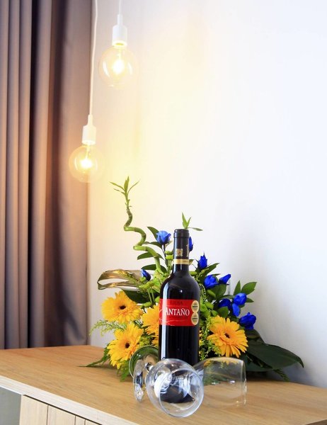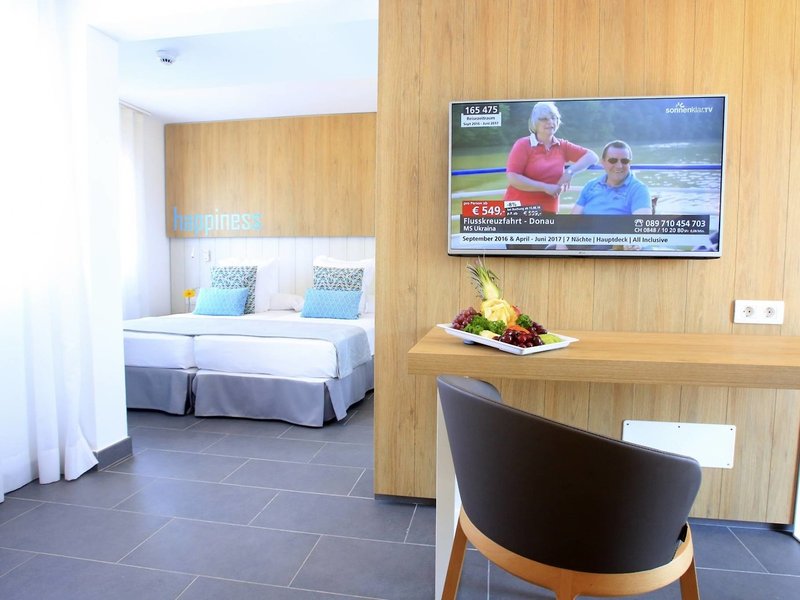 - 1-spálňový apartmán (SUX1), apartmán, nefajčiarska izba, v hlavnej budove, novostavba, cca 42 m², celkový počet izieb v tomto type izby: 2, rozloženie nasledovne: Obývacia izba, 1 spálňa, 2 samostatné postele (100x200cm), 1 rozkladacia pohovka (170x190cm), Detská postieľka: zadarmo, nutná rezervácia, Klimatizácia: zadarmo, studená, teplá, Podlaha: dlažba, Trezor: za poplatok, Sedacia časť, Pohovka, Písací stôl, Telefón, Internet: WLAN/WiFi: zadarmo, Televízor: Plochá obrazovka, v obývacej časti, Satelitná TV, Upratovacia služba: denne, zadarmo, Sprcha, WC, Fén, Balkón alebo terasa: s ležadlami, s posedením