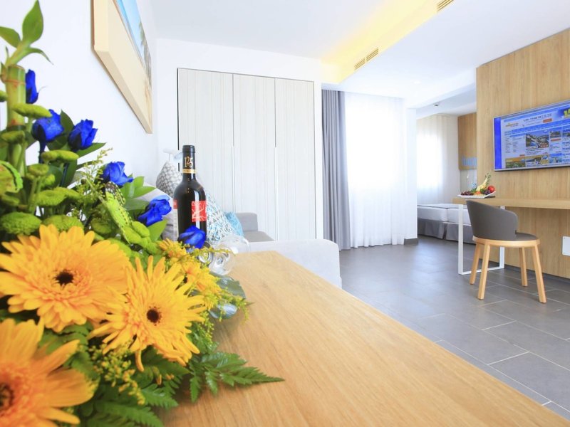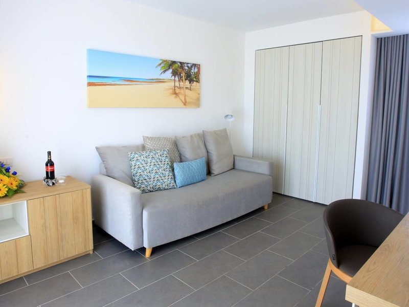 - 1-spálňový apartmán s čiastočným výhľadom na more (SUX5), Apartmán, nefajčiarska izba, v hlavnej budove, novostavba, čiastočný výhľad na more, cca 42 m², celkový počet izieb v tomto type izby: 2, rozloženie nasledovné: Obývacia izba, 1 spálňa, 2 samostatné postele (100x200cm), 1 rozkladacia pohovka (170x190cm), Detská postieľka: zadarmo, nutná rezervácia, Klimatizácia: zadarmo, studená, teplá, Podlaha: dlažba, Trezor: za poplatok, Sedacia časť, Pohovka, Písací stôl, Telefón, Internet: WLAN/WiFi: zadarmo, Televízor: Plochá obrazovka, v obývacej časti, Satelitná TV, Upratovacia služba: denne, zadarmo, Sprcha, WC, Fén, Balkón alebo terasa: s ležadlami, s posedením