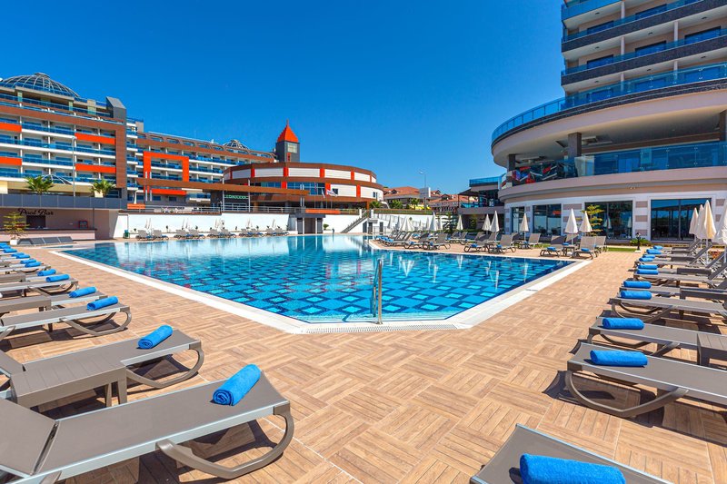 Lage: Die moderne Anlage liegt direkt am Meer an der Fuğla Bucht mit eigenem feinsandigen Sandstrand. In unmittelbarer Nähe ist ein Einkaufszentrum und die Stadt Alanya ist ca. 20 km entfernt, öffentliche Minibus-Verbindungen und Taxis sind vorhanden. Das Hotel ist auch mit dem Zielflughafen Gazipasa (GZP) buchbar, die Entfernung liegt bei 70 km. Der Flughafen Antalya ist 98 km entfernt.