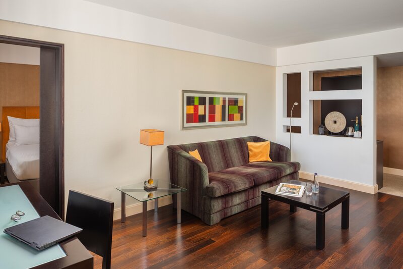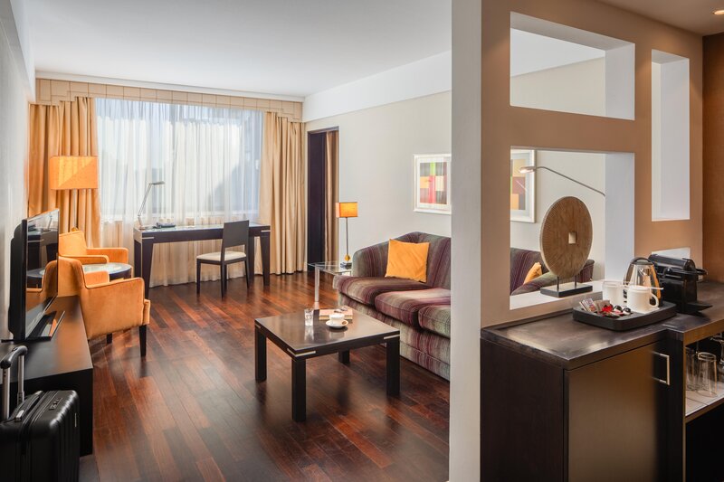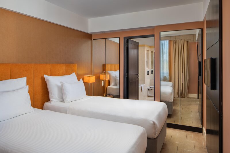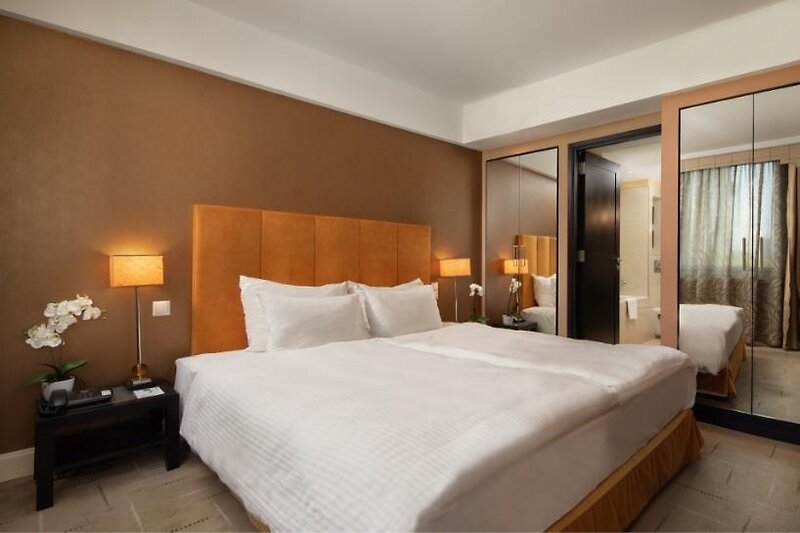[DB03] Superior Doppelzimmer "King/Twin": mind. 24 m², Zimmerkategorie: Superior, Zimmertyp: Doppelzimmer, Anzahl der Räume: Schlafraum 1x, Badezimmer 1x, Anzahl der Betten: Doppelbett 1x, Zustellbett 1x, Gitterbett als Überbelegung möglich: Ja, Allgemein: Klimaanlage - gebührenfrei, Safe - gebührenfrei, Heizung - gebührenfrei, Minibar - optional gegen Gebühr vor Ort, Wasserkocher, Toilettenpapier - gebührenfrei, Bettwäsche - gebührenfrei, Handtücher - gebührenfrei, Badezimmer: Badewanne / Dusche, WC, Haarfön, Bademantel - gebührenfrei, Wohnbereich: Schreibtisch, Sitzecke, Medien & Technik: Telefon, TV, WLAN/WIFI Internetanschluss - gebührenfrei