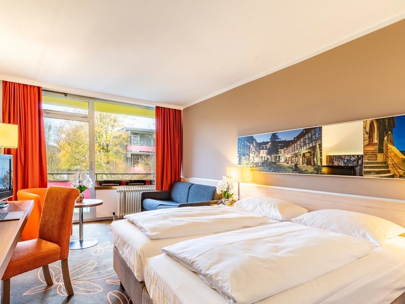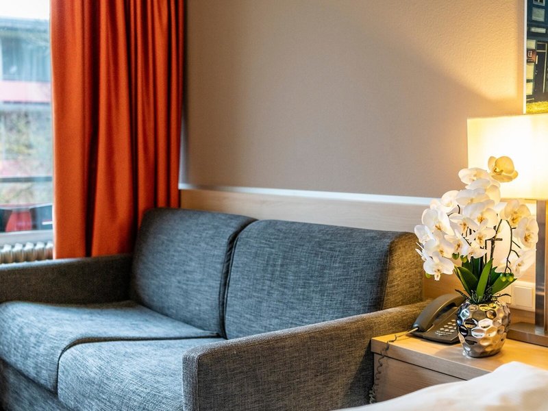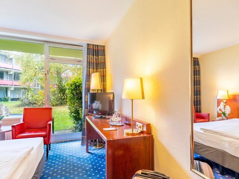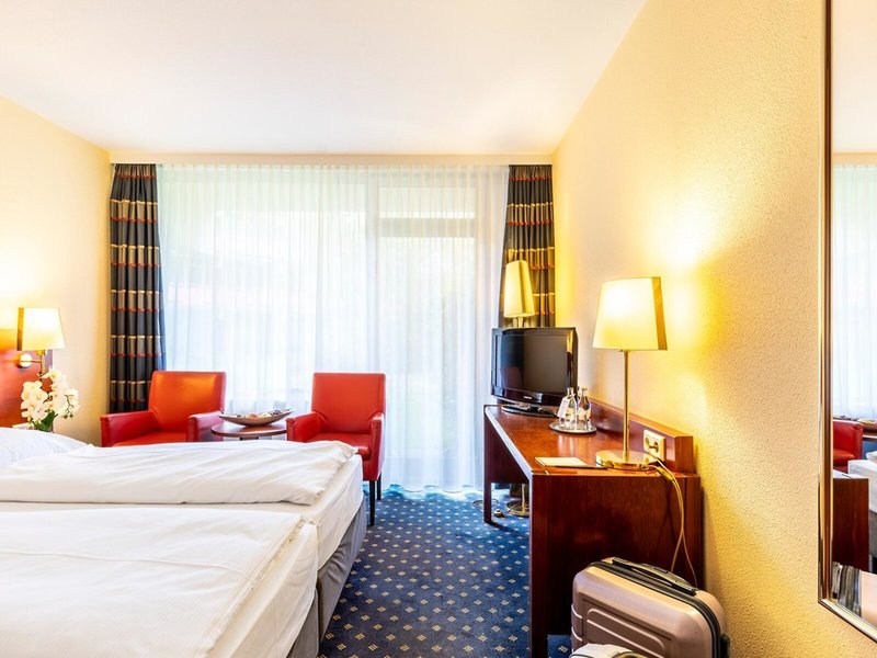 - Doppelzimmer Deluxe (DZX3), Familienzimmer, im Hauptgebäude, Gartenblick, ca. 24 m², Gesamtanzahl der Räume in diesem Zimmertyp: 1, 2 Einzelbetten, Heizung: individuell regelbar, Fußboden: Teppichboden, Sofa, Schreibtisch, Nespressomaschine, Wasserkocher, Minibar: Wasser, Telefon, Internet: WLAN/WiFi: ohne Gebühr, Fernseher: Flatscreen, Dusche, WC, Föhn, Balkon oder Terrasse: mit Sitzgelegenheit