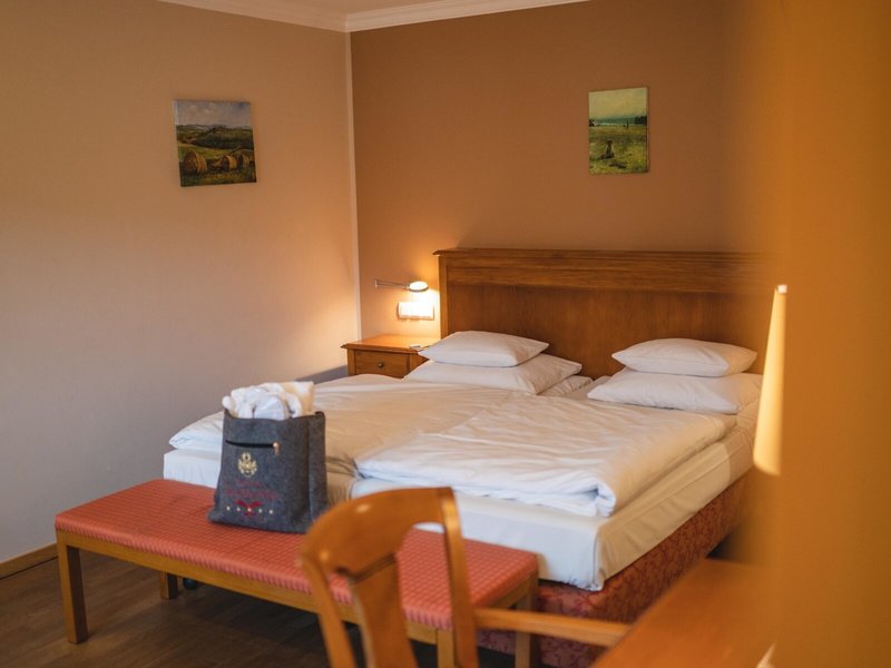 Zimmer im Landhausstil schaffen eine warme, einladende Atmosphäre zum Wohlfühlen. In der hoteleigenen Gastronomie stehen Wildgerichte und regionale Köstlichkeiten im Mittelpunkt. Nach Touren durch die Natur entspannst du im Saunabereich oder auf der Sonnenterrasse. Ein Ort für alle, die