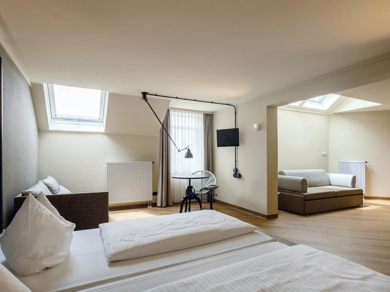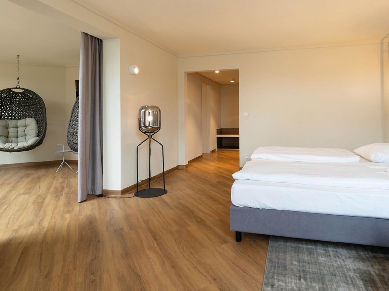 - Suite Typ (SUX1), Familienzimmer, Nichtraucherzimmer, ca. 54 - 54 m², letzte Teilrenovierung 2020, Gesamtanzahl der Räume in diesem Zimmertyp: 2, Aufteilung wie folgt: bestehend aus 2 Zimmern, optisch getrennt ohne Tür oder durch Vorhang, Wohnzimmer, 1 Schlafzimmer, 1 Schlafsofa (180x200cm), 1 Zustellbett, Babybett: ab 10 EUR, Anfrage & Reservierung notwendig, Heizung: individuell regelbar, Fußboden: Laminat, Safe: gegen Gebühr, Sitzecke, Sofa, Schreibtisch, Telefon, Internet: WLAN/WiFi: gegen Gebühr, Fernseher: Flatscreen, im Wohnbereich, im Schlafzimmer, Sat-TV, Roomservice: gegen Gebühr, Reinigungsservice: gegen Gebühr, Badewanne oder Dusche, WC, Bademantel: gegen Gebühr, Slipper: gegen Gebühr, Föhn, Kosmetikspiegel