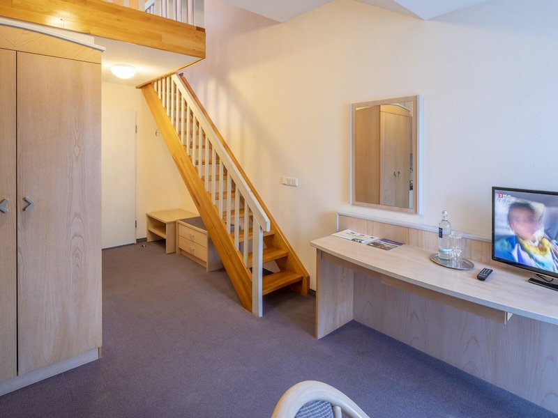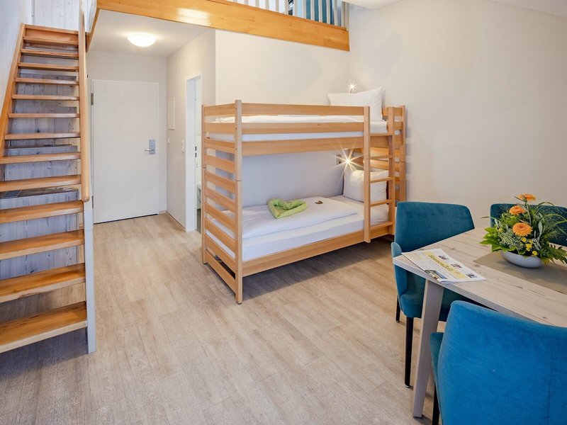 - Komfort Galerie (DZX7), Maisonette, Nichtraucherzimmer, ca. 29 - 34 m², letzte Komplettrenovierung 2019, Gesamtanzahl der Räume in diesem Zimmertyp: 2, Aufteilung wie folgt: Maisonette, 1 Doppelbett, 1 Etagenbett, Heizung: individuell regelbar, Fußboden: PVC, Telefon, Fernseher: Flatscreen, Dusche, WC, Balkon