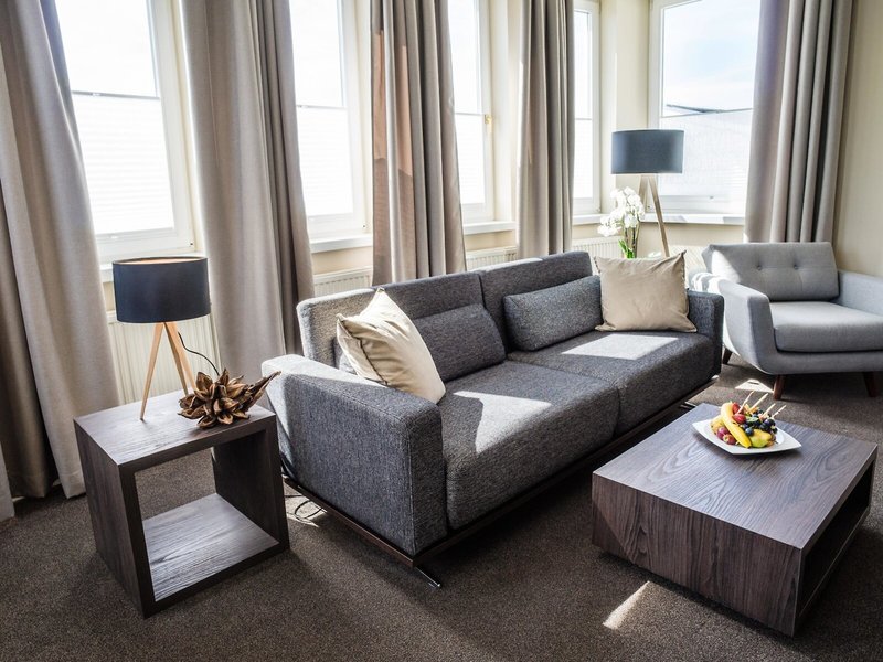 - Suite Promenade (SUX1), apartmán, v prístavbe, morská strana, výhľad na promenádu, cca 50 m², celkový počet izieb v tomto type izby: 2, rozloženie: obývacia izba, 1 spálňa, 1 manželská posteľ (. 180x200cm), kúrenie, podlaha: Koberec, trezor: zadarmo, pohovka, písací stôl, kávovar/čajník, rýchlovarná kanvica, minibar: za poplatok, telefón, Internet: WLAN/WiFi: zadarmo, TV: v obývacej časti , v kúpeľni, nemecký program, satelitná TV, rádio, Izbová služba: denne 9:00 - 21:00, za poplatok, upratovacia služba: za poplatok, samostatný sprchovací kút, vaňa, WC, župan: bez poplatku, fén, kozmetické zrkadlo