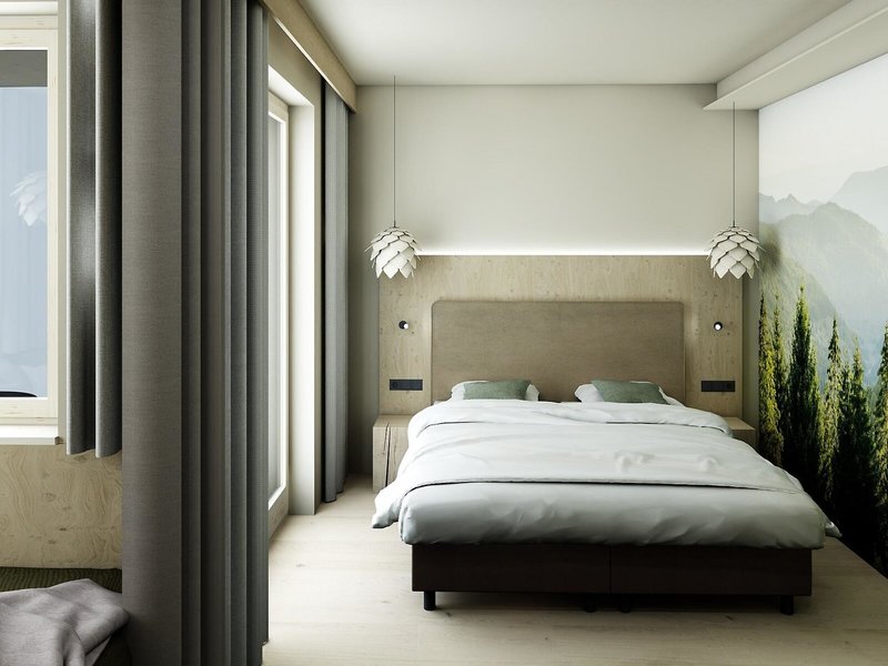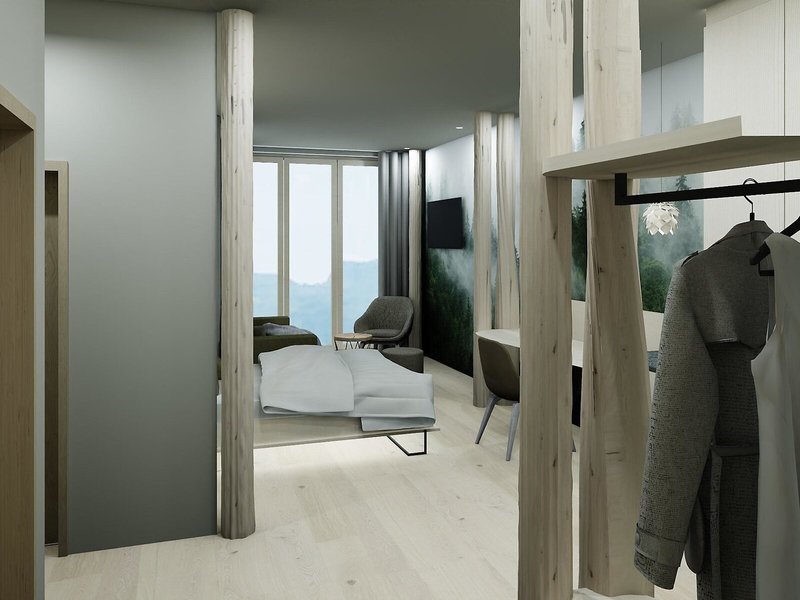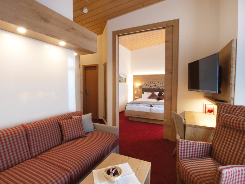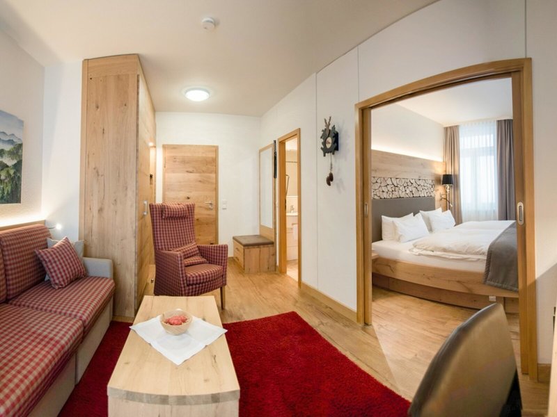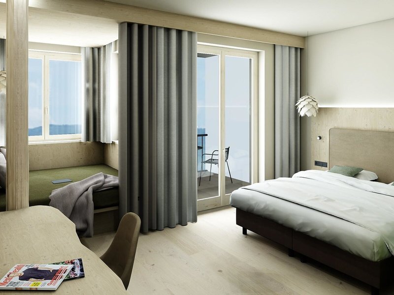 - Weißtannen Family Suite (SUX2), Suite, Nichtraucherzimmer, Neubau, Bergblick, ca. 39 m², letzte Komplettrenovierung 2025, Gesamtanzahl der Räume in diesem Zimmertyp: 2, Aufteilung wie folgt: bestehend aus 2 Doppelzimmern mit Verbindungstür, 2 Schlafzimmer, 2 Doppelbetten (180x200cm), 1 Schlafsofa (180x200cm), Klimaanlage: zentral gesteuert, Heizung: Fußbodenheizung, Fußboden: Parkett, Safe, Sofa, Schreibtisch, Kaffee-/Teezubereiter, Wasserkocher, Minibar: gegen Gebühr, Softdrinks: gegen Gebühr, Wasser: gegen Gebühr, alkoholische Getränke: gegen Gebühr, Snacks: gegen Gebühr, Telefon, Internet: WLAN/WiFi: ohne Gebühr, Fernseher: Flatscreen, im Wohnbereich, im Schlafzimmer, deutsches Programm, Radio, Roomservice: gegen Gebühr, Reinigungsservice, Dusche, WC, separates WC, Bademantel, Slipper, Föhn, Kosmetikspiegel, Balkon: mit Sitzgelegenheit