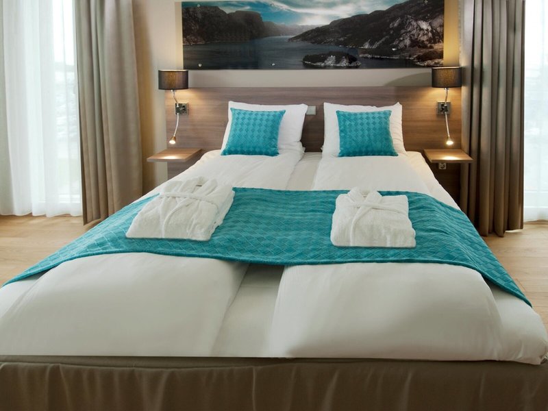 Vaše ubytovanie: Kúrenie zabezpečuje príjemnú vnútornú klímu v izbách. Izby s kobercami sú vybavené manželskou posteľou. Prístelky je možné vyžiadať. K dispozícii je aj trezor a písací stôl. Súčasťou štandardného vybavenia je aj chladnička. Pre väčšie pohodlie hostí je k dispozícii žehliaca súprava. K dispozícii je tiež televízor, budík a Wi-Fi (bezplatné). Kúpeľne sú vybavené sušičom vlasov a kozmetickým zrkadlom na každodenné použitie. Ako špeciálne vybavenie si hostia môžu vychutnať kozmetické produkty a výber uterákov v kúpeľniach. K dispozícii je tiež 19 izieb s bezbariérovým prístupom a bezbariérovými kúpeľňami. Pre rodičov s deťmi sú k dispozícii rodinné izby.