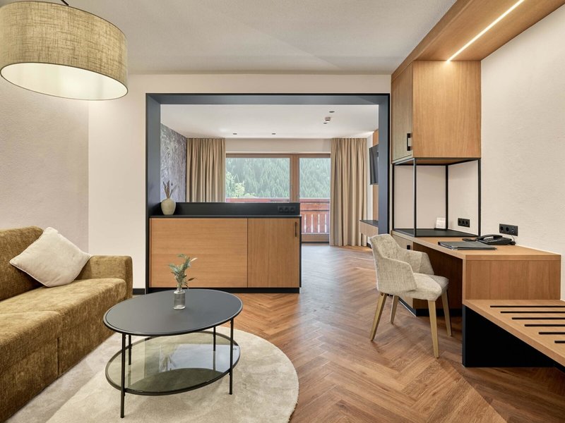 - Doppelzimmer Morgengold (APX1), Appartement, im Hauptgebäude, Südseite, Bergblick, ca. 45 m², letzte Komplettrenovierung 2025, kombiniertes Wohn-/Schlafzimmer, 1 Doppelbett, Babybett: ohne Gebühr, Reservierung notwendig, Heizung: Fußbodenheizung, Fußboden: Parkett, Safe, Sofa, Schreibtisch, Minibar: Minibarauffüllung, Telefon, Internet: WLAN/WiFi, Fernseher: Flatscreen, Sat-TV, Radio, Sony Playstation, Reinigungsservice: täglich, Dusche, Regendusche, separates WC, Bademantel, Slipper, Föhn, Kosmetikspiegel, Balkon: mit Sitzgelegenheit