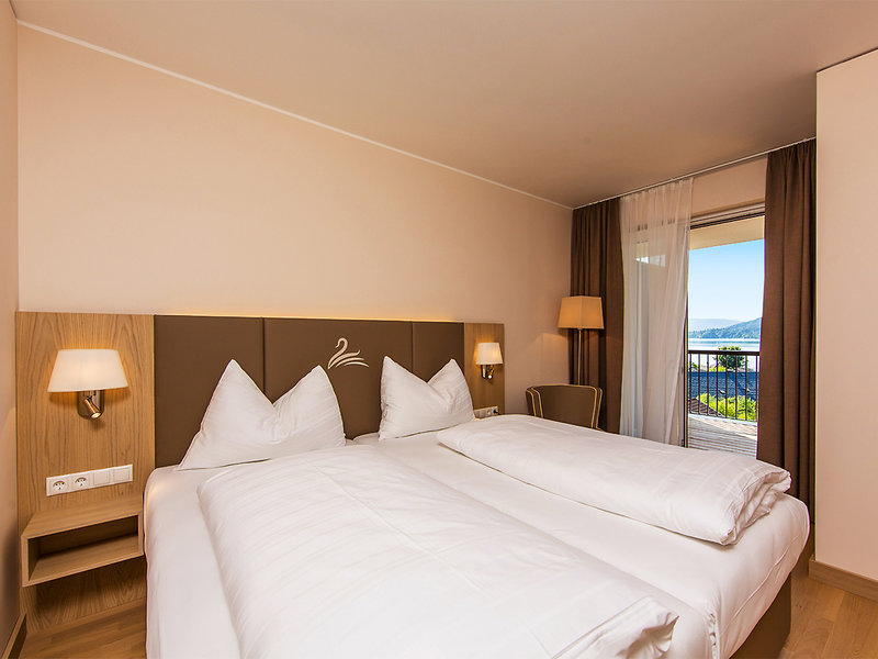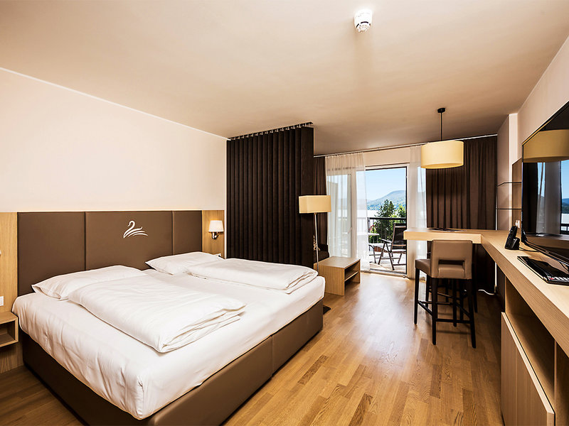 Lage: In Krumpendorf, nur 1 Gehminute vom hoteleigenen Privatstrand am Wörthersee entfernt, ca. 1 km ins Zentrum, ca. 7 km zum Bahnhof Klagenfurt.