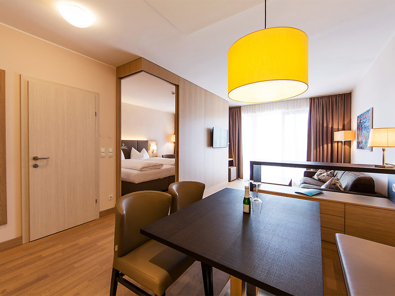 Wohnen: Junior Suite (JS, ca. 34 qm), Studio mit offenem Wohn-/Schlafbereich, Boxspringbett, Schlafsofa für 1 Person, TV, Safe, Nespresso-Kapselmaschine, Wasserkocher, Kühlschrank, 2 Kochplatten. Dusche, WC. Balkon oder Loggia: Max. 3E