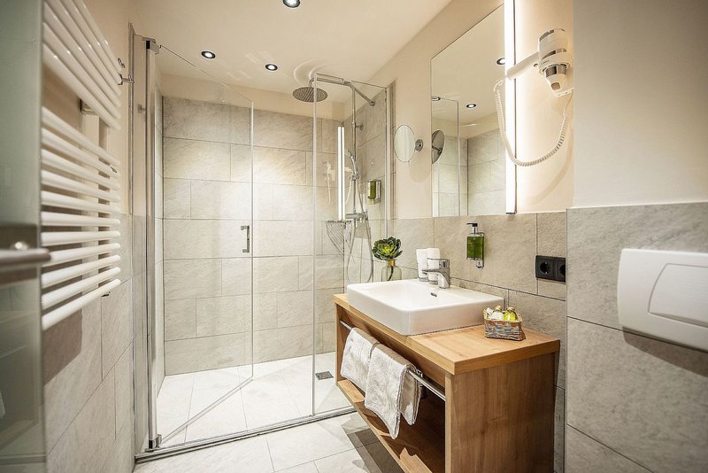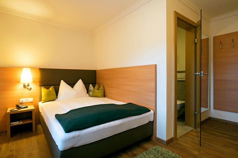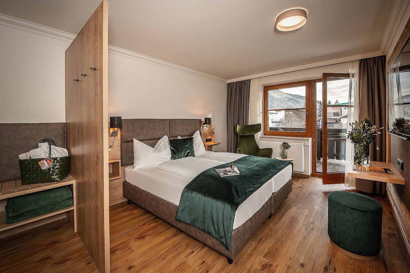 Doppelzimmer Alpin: Die in Waldtönen eingerichteten Zimmer,,Alpin'' verfügen teilweise über einen Balkon mit Bergblick und haben außerdem ein Französiches Bett, Dusche/WC, Safe, Telefon, Kabel-TV, Föhn und Holzboden, sowie eine Spa-Tasche mit Bademantel & Badetuch im Zimmer (ca. 25-28m², D).