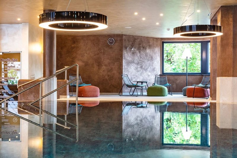 Wellness: Großer Wellnessbereich "Nordic Spa" mit Indoor-Pool (ca. 11 x 10m), Finnische Sauna, Aroma- und Sole-Dampfbad, Infrarot-Wärmekabinen, Kaltwasserbecken, Kneippstation, Ruheraum, Relaxzone, Vitalbar mit Tees aus biologischem Anbau der Marke Viropa und Vitalgetränken (zu den Öffnungszeiten inklusive) und Wellnessgarten.