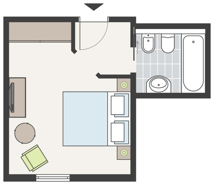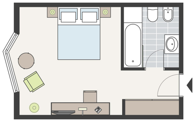 - Einzelzimmer (EZX1), Einzelzimmer, Nordseite, ca. 25 m², Gesamtanzahl der Räume in diesem Zimmertyp: 1, Aufteilung wie folgt: 1 Schlafzimmer, Heizung: individuell regelbar, Fußboden: Parkett, Safe: ohne Gebühr, Schreibtisch, Wasserkocher, Minibar: gegen Gebühr, Telefon, Internet: WLAN/WiFi: ohne Gebühr, Fernseher: Sat-TV, Roomservice: gegen Gebühr, Reinigungsservice: täglich, ohne Gebühr, Badewanne oder Dusche, WC, Föhn