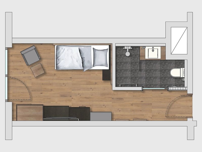 • Einzelzimmer ohne Balkon (EZX2), Bergblick, ca. 15 - 18 m², 1 Einzelbett (120x200cm), Heizung: individuell regelbar, Fußboden: Teppichboden, Safe, Schreibtisch, Telefon, Internet: WLAN/WiFi, Fernseher: deutsches Programm, Sat-TV, Dusche, WC, Föhn, Kosmetikspiegel