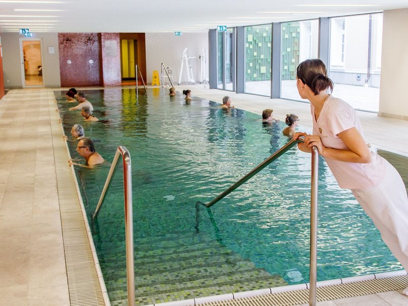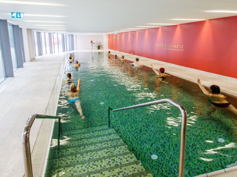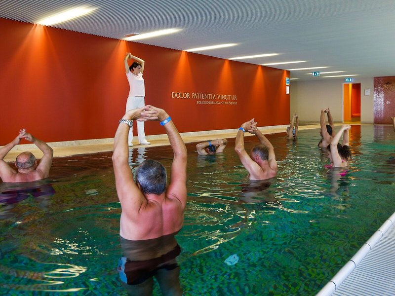 Sport & Fitness: Angenehm beheiztes Wasser in den Innen- und Außenpools sorgt für ein gesundes Badeerlebnis. Erfrischende Getränke an der Pool-/Snackbar und wohlige Entspannung im Whirlpool bringen alle Wasserratten in die beste Stimmung. Auf der Sonnenterrasse mit Liegestühlen und Schirmen lässt sich der Urlaub genießen. Wem der Sinn nach Bewegung steht, werden Radfahren/Mountainbiking und Nordic Walking angeboten. Freunden des Wassersports wird Aqua-Fitness angeboten. Fitnessstudio, Tischtennis und Aerobic sind Teil des Sport- und Freizeitangebots der Unterbringung. Im Haus werden verschiedene Wellnessangebote wie Spa, Sauna, Dampfbad, Hammam, Schönheitssalon, Massage-Anwendungen, Kuranwendungen, Hydrotherapie-Anwendungen, Anti-Aging-Anwendungen, Ayurveda-Anwendungen und Solarium offeriert. Abendliche Unterhaltung finden die Gäste bei Live-Musik.