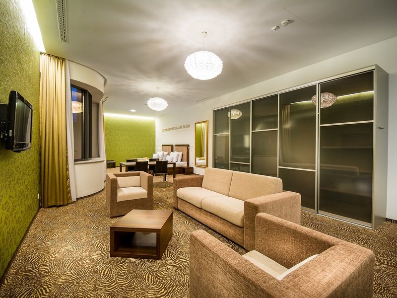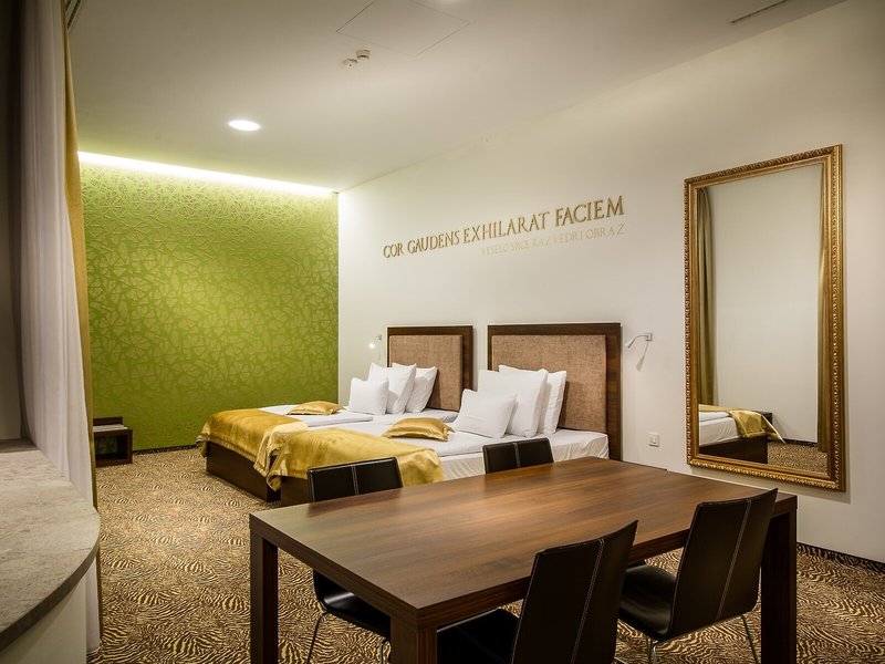 Vaše ubytovanie: Klimatizácia a kúrenie zabezpečujú príjemnú vnútornú klímu. Väčšina izieb ponúka terasu pre väčšie pohodlie, ktorá vás pozýva na relax. Izby sú vybavené manželskou posteľou a rozkladacou pohovkou. Pre našich najmenších hostí sú k dispozícii aj detské postieľky. K dispozícii je aj trezor, minibar a písací stôl. K dispozícii je aj telefón, TV a Wi-Fi pripojenie na internet (bezplatne). K vybaveniu izieb patria papuče. Kúpeľne sú vybavené sprchovacím kútom, vaňou a vírivkou. K dispozícii je sušič vlasov a župany. Hotel ponúka nefajčiarske izby.