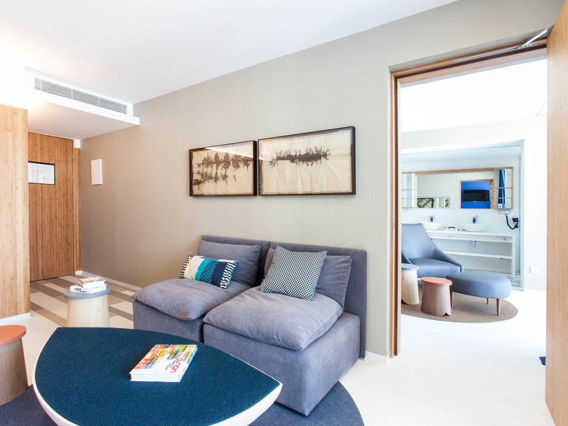 - Loft (JSM1), Juniorsuite, im Nebengebäude, Meerseite, Meerblick, Poolblick, ca. 50 m², letzte Komplettrenovierung 2016, Gesamtanzahl der Räume in diesem Zimmertyp: 1, Aufteilung wie folgt: kombiniertes Wohn-/Schlafzimmer, 1 King Size Bett, Babybett, Klimaanlage: individuell regelbar, kalt, warm, Heizung: individuell regelbar, Fußboden: Fliesenboden, Safe, Sofa, Schreibtisch, Bügeleisen, Bügelbrett, Nespressomaschine, Minibar: gegen Gebühr, Softdrinks: gegen Gebühr, Wasser: gegen Gebühr, alkoholische Getränke: gegen Gebühr, Snacks: gegen Gebühr, Minibarauffüllung, Telefon, Internet: WLAN/WiFi: ohne Gebühr, Breitband-Internet/DSL: ohne Gebühr, Fernseher: Flatscreen, im Schlafzimmer, Roomservice: gegen Gebühr, Reinigungsservice: ohne Gebühr, Tageszeitung: ohne Gebühr, separate Dusche, Badewanne, WC, Bademantel: ohne Gebühr, Slipper, Föhn, Französischer Balkon