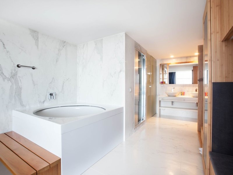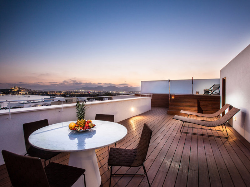 - Dvojúrovňový apartmán Suite (SUX1), suita, nová budova, výhľad na more, výhľad na bazén, cca 100 m², posledná kompletná rekonštrukcia v roku 2016, celkový počet izieb v tomto type izby: 2, rozloženie: kombinovaná obývacia izba/spálňa, obývacia izba, mezonet, 2 spálne, 2 manželské postele, detská postieľka, klimatizácia: individuálne nastaviteľná, studená, teplá, kúrenie: individuálne nastaviteľná, podlaha: dlažba, trezor, pohovka, písací stôl, žehlička, žehliaca doska, kuchyňa, Nespresso automat, minibar: za poplatok, nealko nápoje: za poplatok, voda : za poplatok, alkoholické nápoje: za poplatok, občerstvenie: za poplatok, doplnenie zásob minibaru, telefón, Internet: WLAN/WiFi: bez poplatku, širokopásmový internet /DSL: bez poplatku, TV: plochá obrazovka, izbová služba: za poplatok, upratovanie: bez poplatku, denná tlač: zadarmo, samostatná sprcha, vaňa, vírivka, WC, župan: zadarmo, papuče, 2 kúpeľne , fén, balkón: s posedením, balkón alebo terasa: s ležadlami, s posedením, s vlastným bazénom, terasa: strešná terasa, s ležadlami, s ležadlami, so sprchou, s vlastným bazénom