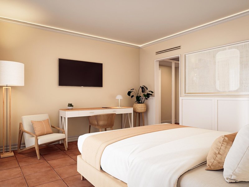 - Promotion Double room (DZZ1), Doppelzimmer, im Hauptgebäude, zum Innenhof gelegen, Innenhofblick, Blick auf Jardin, ca. 20 m², letzte Komplettrenovierung 2017, letzte Teilrenovierung 2017, Gesamtanzahl der Räume in diesem Zimmertyp: 1, 2 Einzelbetten (100x200cm), Babybett: ohne Gebühr, Klimaanlage: ohne Gebühr, Juni und September, Heizung: Februar und Mai, Fußboden: Fliesenboden, Safe: gegen Gebühr, Getränkespender, Schreibtisch, Minibar: gegen Gebühr, Softdrinks: gegen Gebühr, Wasser: gegen Gebühr, alkoholische Getränke: gegen Gebühr, Telefon, Internet: WLAN/WiFi: ohne Gebühr, Fernseher: Flatscreen, im Schlafzimmer, deutsches Programm, Sat-TV, Reinigungsservice: 08:00 Uhr - 15:00 Uhr, ohne Gebühr, Badewanne oder Dusche, WC, Föhn, Kosmetikspiegel, Balkon: mit Sitzgelegenheit, Balkon oder Terrasse
