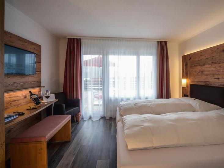 Wohnen: [3B01] Dreibettzimmer Balkon Bergblick: mind. 21 m², Zimmertyp: Dreibettzimmer, Anzahl der Räume: Schlafraum 1x, Badezimmer 1x, Anzahl der Betten: Doppelbett 1x, Schlafsofa für 1 Person 1x, Gitterbett als Überbelegung möglich: Ja, Allgemein: Safe - gebührenfrei, Heizung, Balkon, Badezimmer: WC, Haarfön, Dusche, Medien & Technik: Telefon, TV, WLAN/WIFI Internetanschluss - gebührenfrei, Zimmerausblick: Bergblick