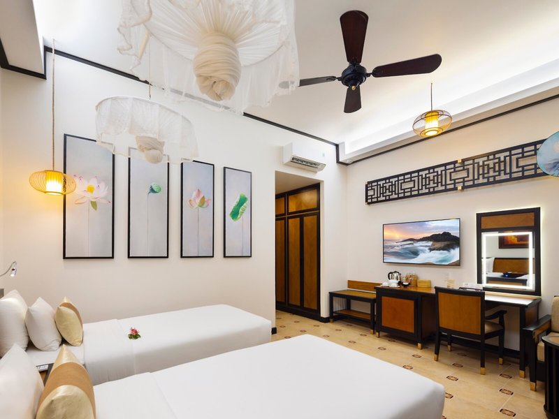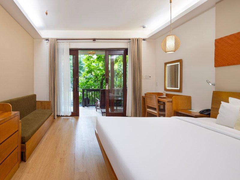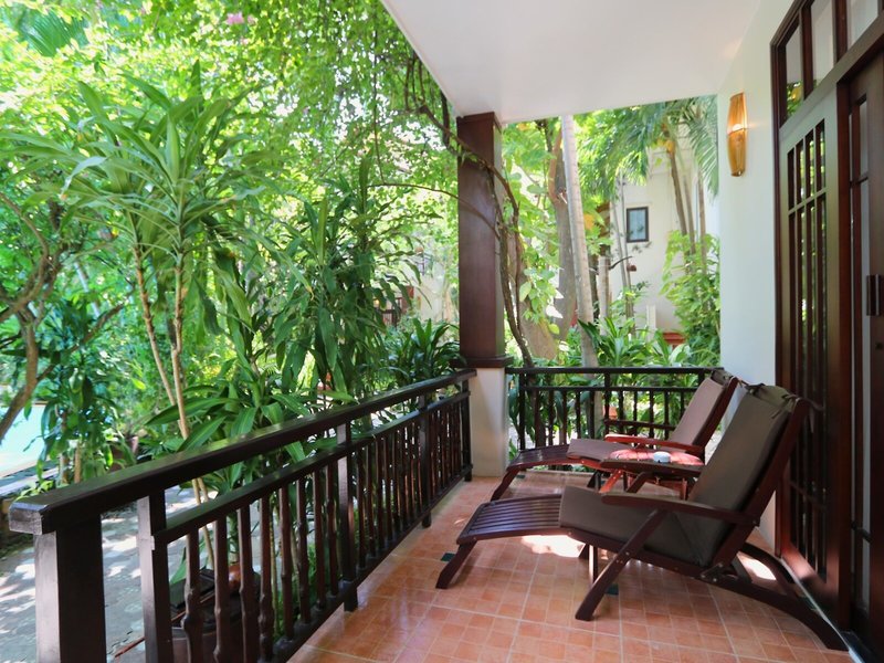 - Indochine Deluxe (DZG1), Doppelzimmer, Nichtraucherzimmer, im Hauptgebäude, Landseite, Gartenblick, ca. 37 m², letzte Komplettrenovierung 2009, letzte Teilrenovierung 2018, Gesamtanzahl der Räume in diesem Zimmertyp: 1, Aufteilung wie folgt: 1 Schlafzimmer, 1 Queen Size Bett, Babybett: ohne Gebühr, Moskitonetz, Klimaanlage: ohne Gebühr, individuell regelbar, kalt, Fußboden: Fliesenboden, Safe: ohne Gebühr, Deckenventilator, Getränkespender, Sofa, Schreibtisch, Kaffee-/Teezubereiter, Wasserkocher, Minibar: gegen Gebühr, Softdrinks: gegen Gebühr, Wasser: gegen Gebühr, Snacks: gegen Gebühr, Telefon, Internet: WLAN/WiFi: ohne Gebühr, Fernseher: Flatscreen, im Schlafzimmer, deutsches Programm, Kabel-TV, Roomservice: täglich 24 Stunden, gegen Gebühr, Reinigungsservice: täglich, ohne Gebühr, Badewanne oder Dusche, WC, Bademantel: ohne Gebühr, Slipper: ohne Gebühr, Föhn, Kosmetikspiegel, Balkon oder Terrasse: mit Liegestühlen, mit Sitzgelegenheit