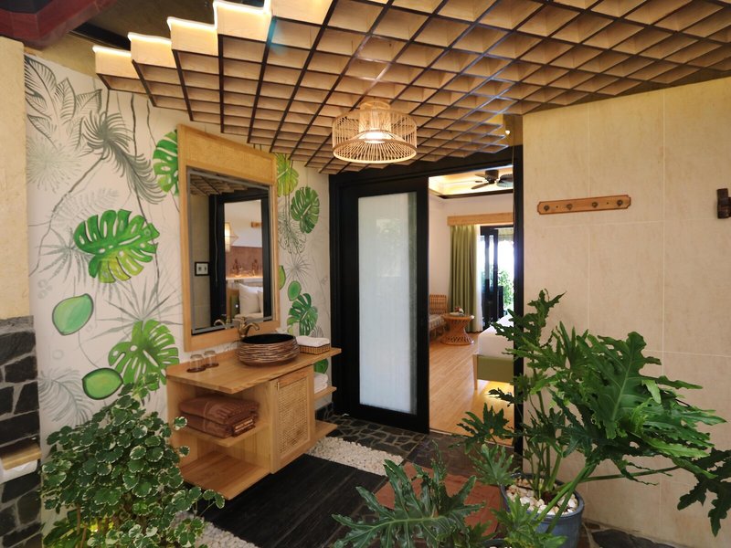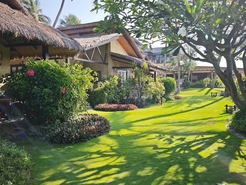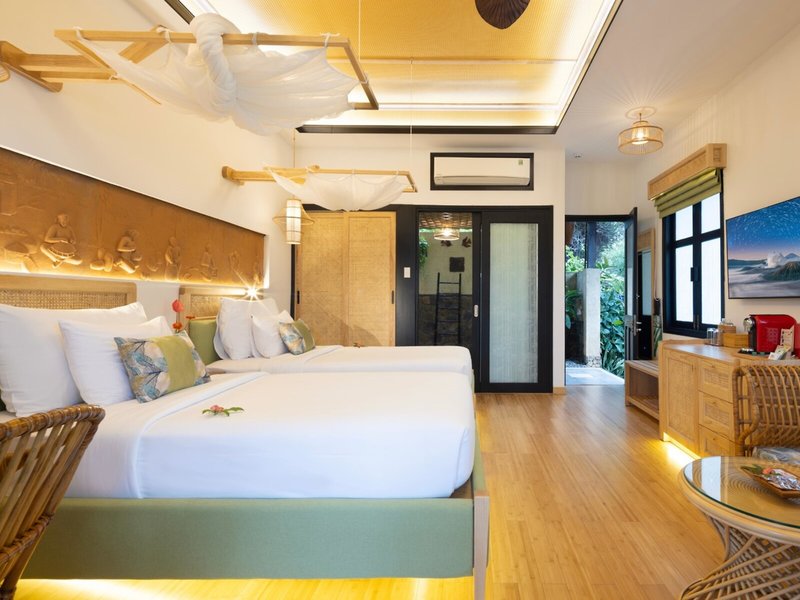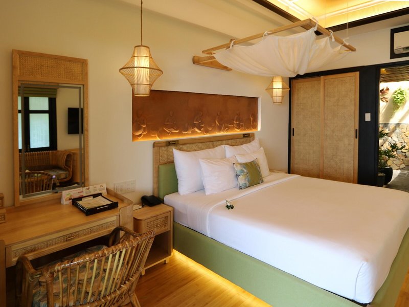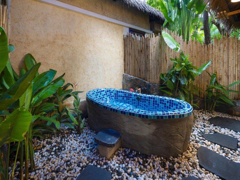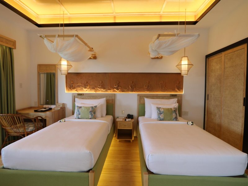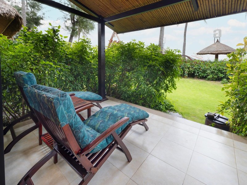 - Serene Oasis Bungalow (BUG1), Bungalow, Nichtraucherzimmer, Gartenblick, ca. 39 - 40 m², letzte Komplettrenovierung 2023, letzte Teilrenovierung 2023, Gesamtanzahl der Räume in diesem Zimmertyp: 1, Aufteilung wie folgt: kombiniertes Wohn-/Schlafzimmer, 1 Doppelbett (180x200cm), 1 Schlafsofa (100x200cm), Babybett: ohne Gebühr, Moskitonetz, Klimaanlage: ohne Gebühr, individuell regelbar, Fußboden: Fliesenboden, Safe: ohne Gebühr, Deckenventilator, Sofa, Schreibtisch, Kaffee-/Teezubereiter, Wasserkocher, Minibar: gegen Gebühr, Softdrinks: gegen Gebühr, Wasser: gegen Gebühr, Snacks: gegen Gebühr, Telefon, Internet: WLAN/WiFi: ohne Gebühr, Fernseher: Flatscreen, im Schlafzimmer, Kabel-TV, Roomservice: täglich 24 Stunden, gegen Gebühr, Reinigungsservice: täglich, ohne Gebühr, Badewanne, WC, Bademantel: ohne Gebühr, Slipper: ohne Gebühr, Föhn, Terrasse: mit Liegestühlen