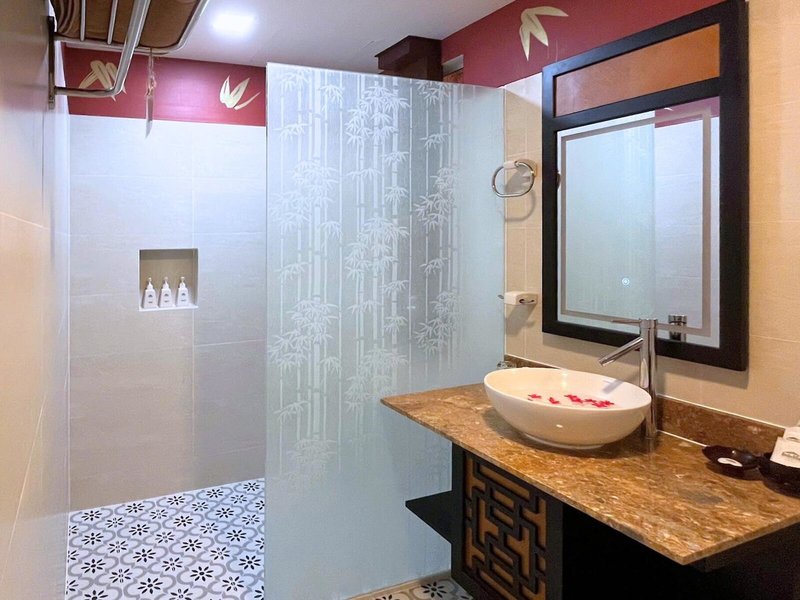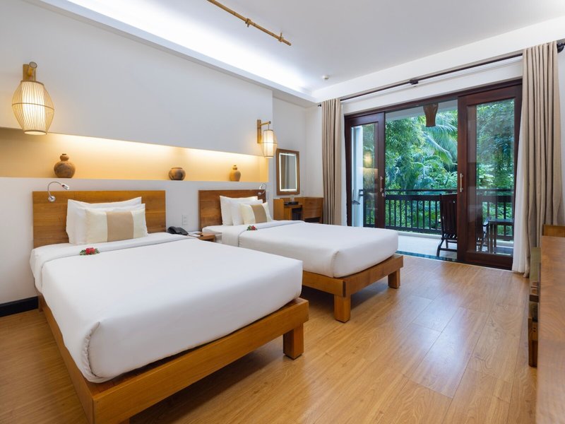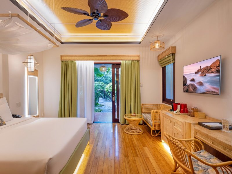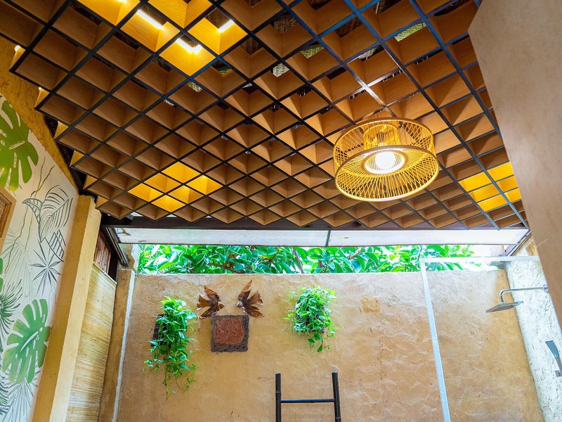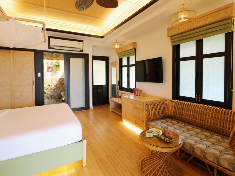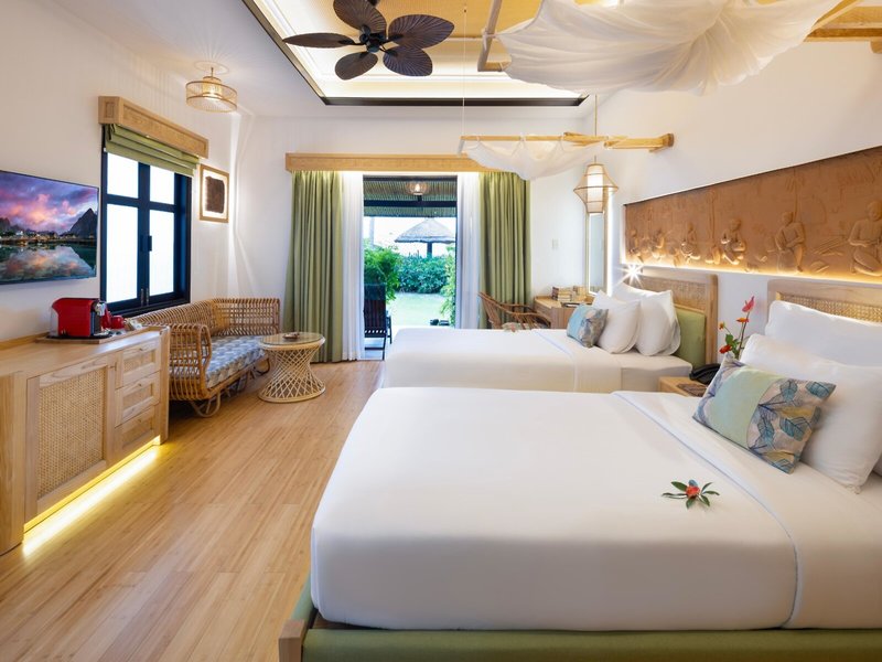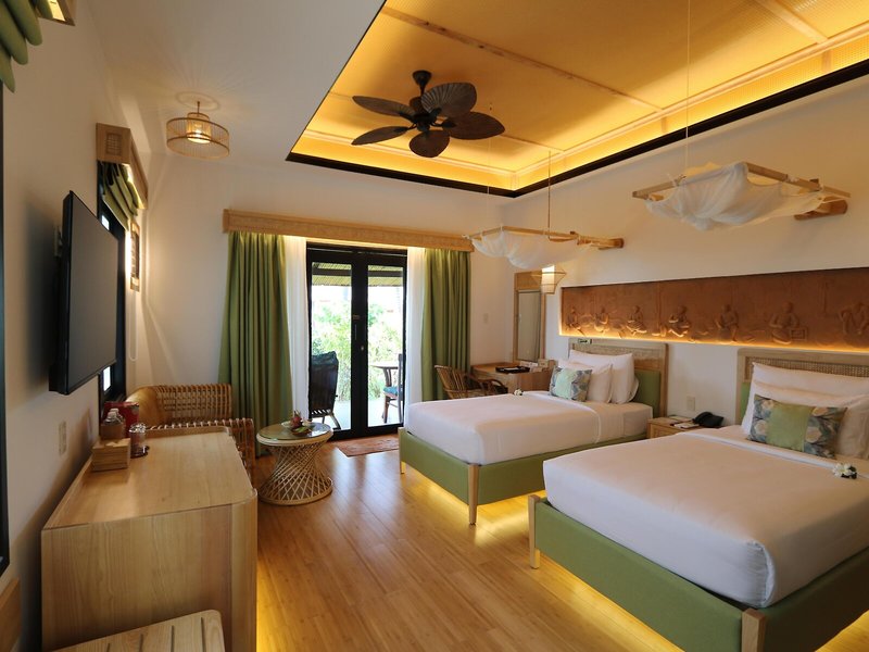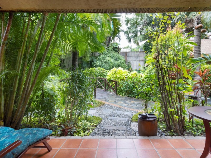 - Serene Oasis Bungalow (BUG1), Bungalow, Nichtraucherzimmer, Gartenblick, ca. 39 - 40 m², letzte Komplettrenovierung 2023, letzte Teilrenovierung 2023, Gesamtanzahl der Räume in diesem Zimmertyp: 1, Aufteilung wie folgt: kombiniertes Wohn-/Schlafzimmer, 1 Doppelbett (180x200cm), 1 Schlafsofa (100x200cm), Babybett: ohne Gebühr, Moskitonetz, Klimaanlage: ohne Gebühr, individuell regelbar, Fußboden: Fliesenboden, Safe: ohne Gebühr, Deckenventilator, Sofa, Schreibtisch, Kaffee-/Teezubereiter, Wasserkocher, Minibar: gegen Gebühr, Softdrinks: gegen Gebühr, Wasser: gegen Gebühr, Snacks: gegen Gebühr, Telefon, Internet: WLAN/WiFi: ohne Gebühr, Fernseher: Flatscreen, im Schlafzimmer, Kabel-TV, Roomservice: täglich 24 Stunden, gegen Gebühr, Reinigungsservice: täglich, ohne Gebühr, Badewanne, WC, Bademantel: ohne Gebühr, Slipper: ohne Gebühr, Föhn, Terrasse: mit Liegestühlen